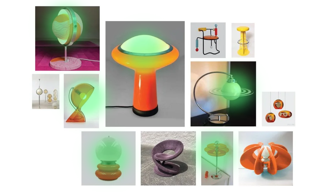 Exploration of retro-future and 70s style light pieces. I was inspired by the forms that had spheres intersecting planes. I also looked at forms that played with non-traditional lamp forms.