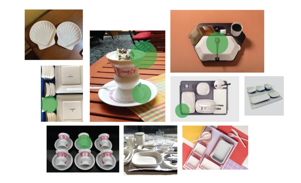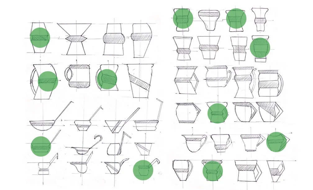 Based on my breakdown, I sketched various forms for the dishware pieces I would need. I found that forms with inverse curves stood out for their Rudeshiemer-like form and potential stackability.